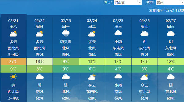 中国天气网讯 今天(2月21日)河南风力较强,部分地区会伴有扬沙和浮尘,同时大部地区将继续升温,郑州最高气温可达27℃,或创今年来气温新高。明后两天,河南大部将迎来降雨和大幅降温,恰逢春节假期返程时段,需注意防范。